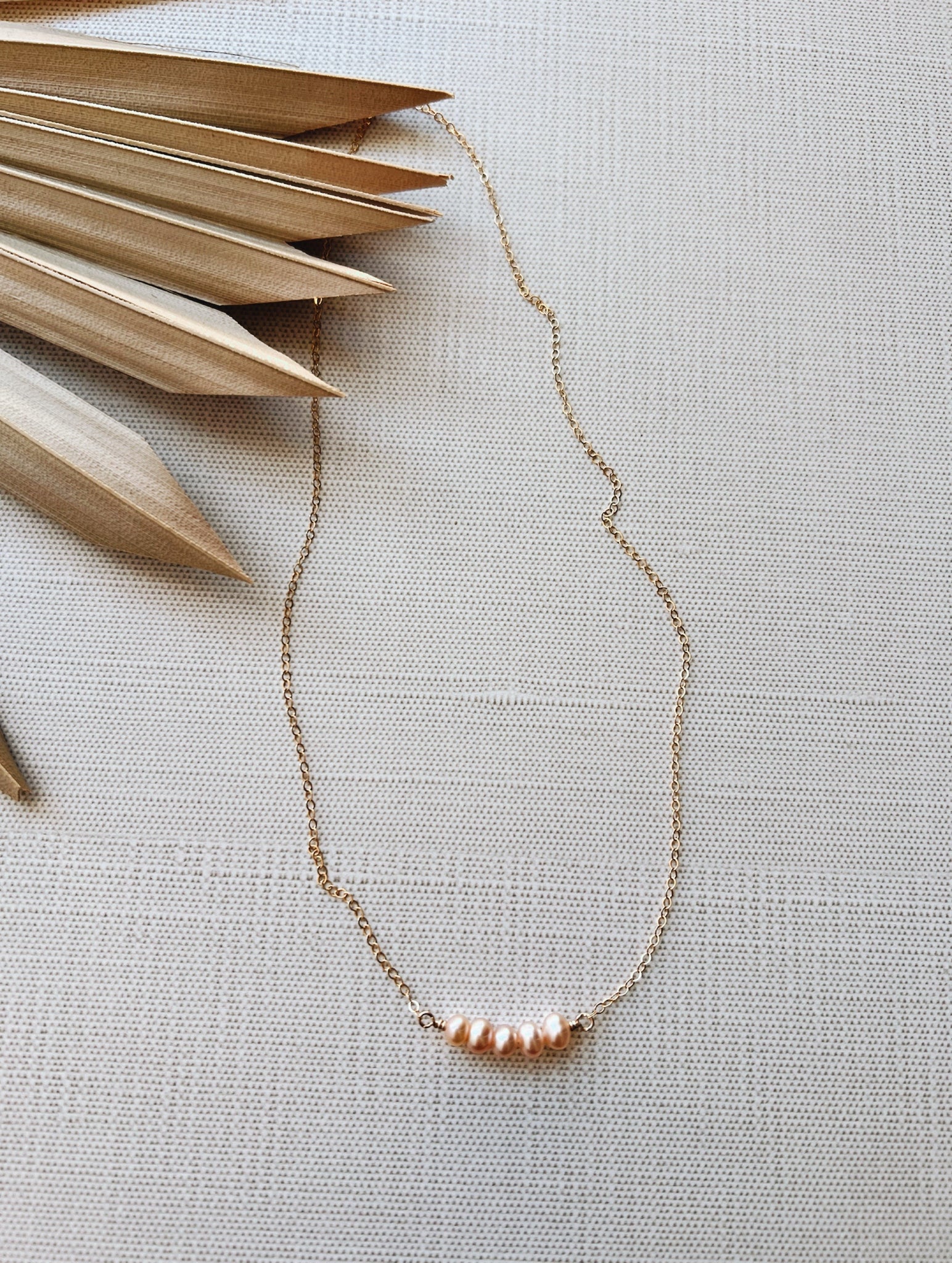 The Pearl Necklace no. 7 features five peach colored pearls on your choice of a dainty 14k gold fill or .925 sterling silver cable chain. Ideal for layering, this necklace offers a classic touch to both casual and formal looks. 16 inches in length with a 2 inch adjustable extender.