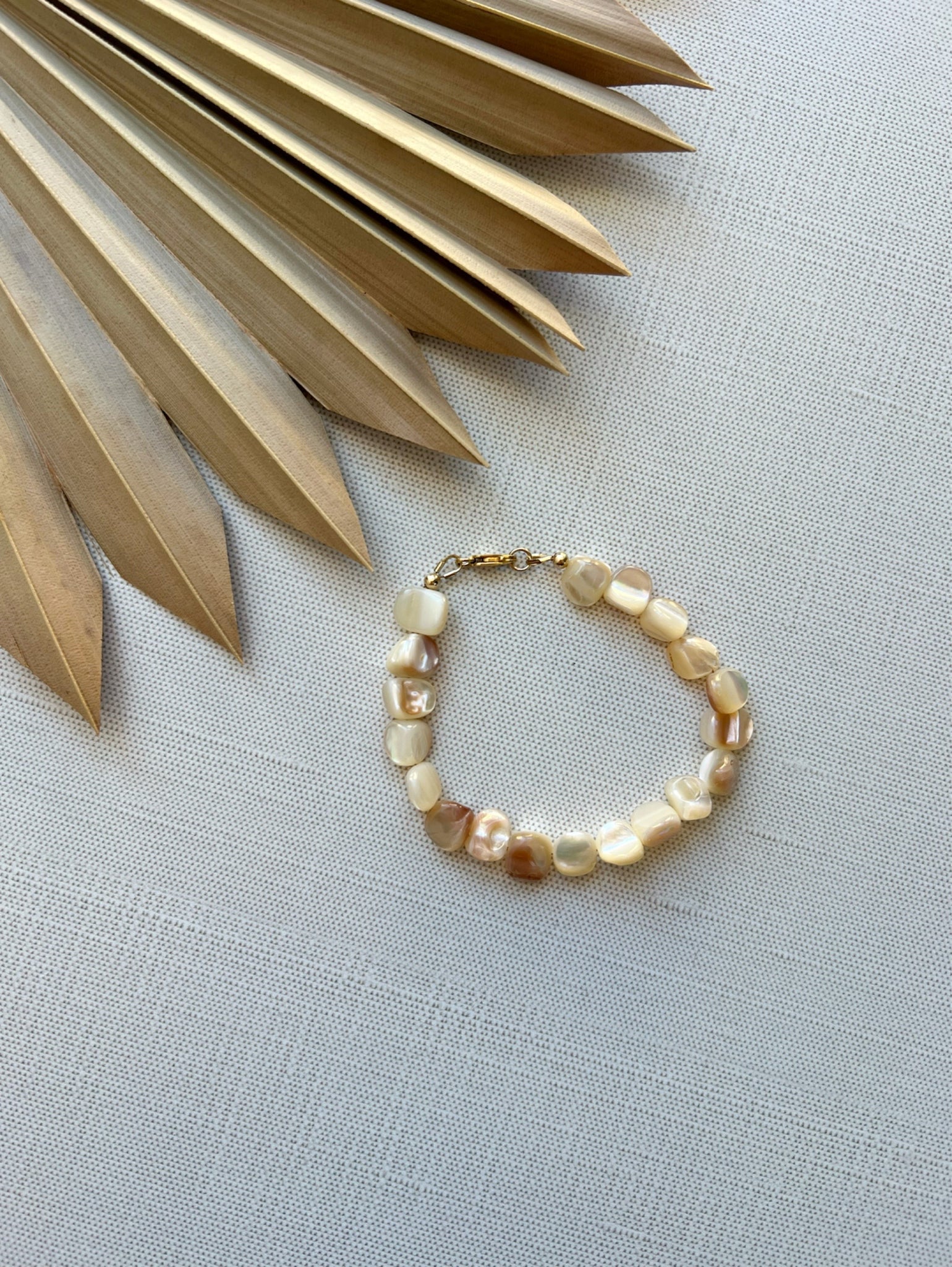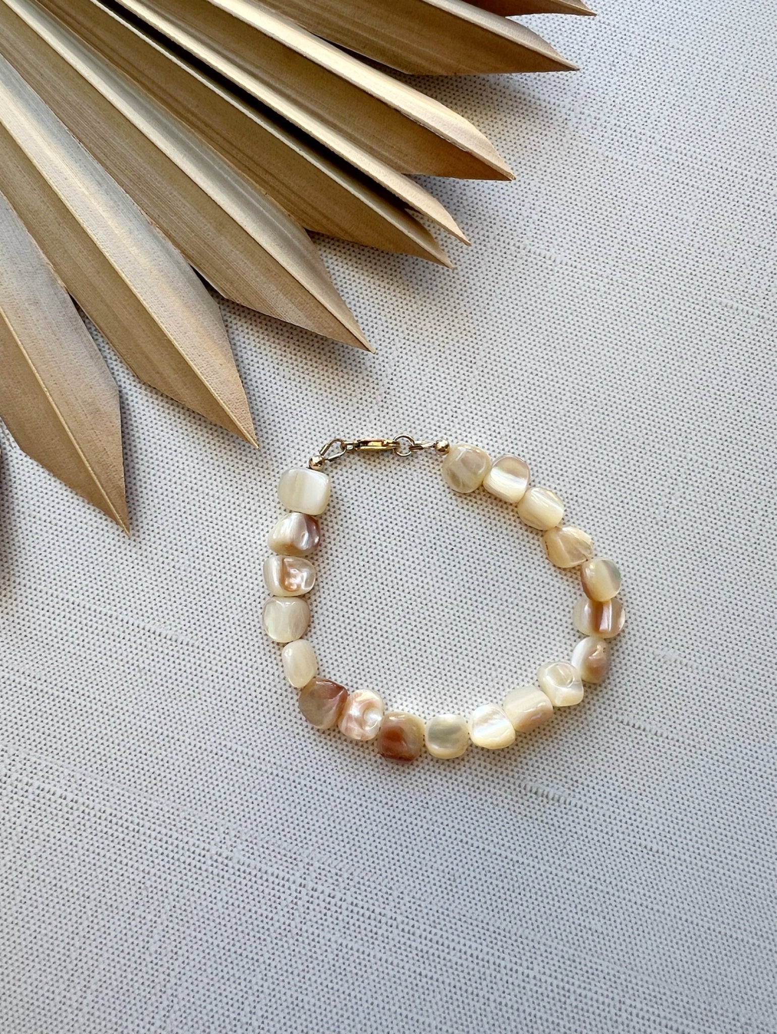 The Shells & Kisses Bracelet features pink and white pearlescent shell beads strung on durable beading wire and 14k gold fill clasp and findings. The perfect beachy gift!