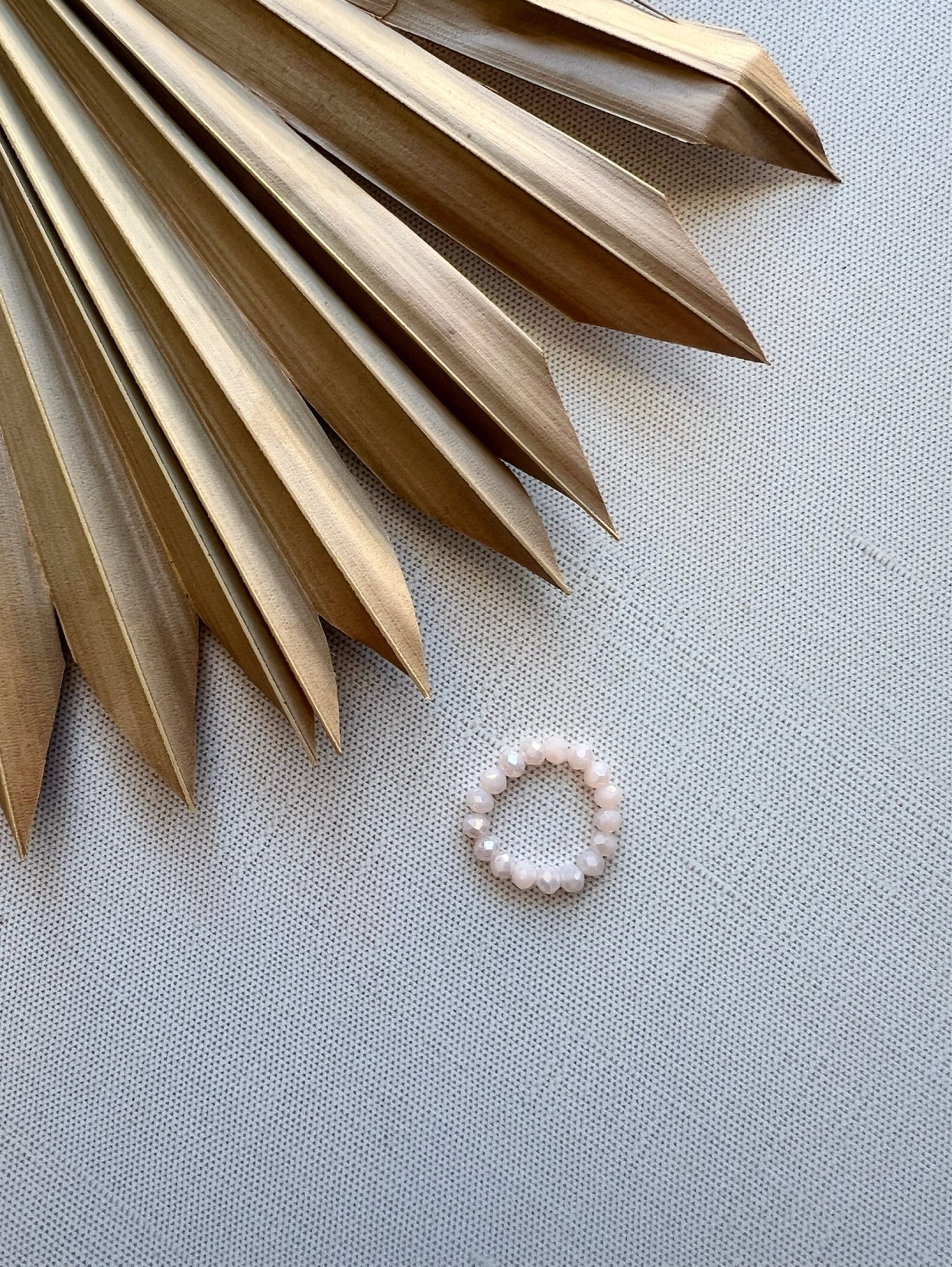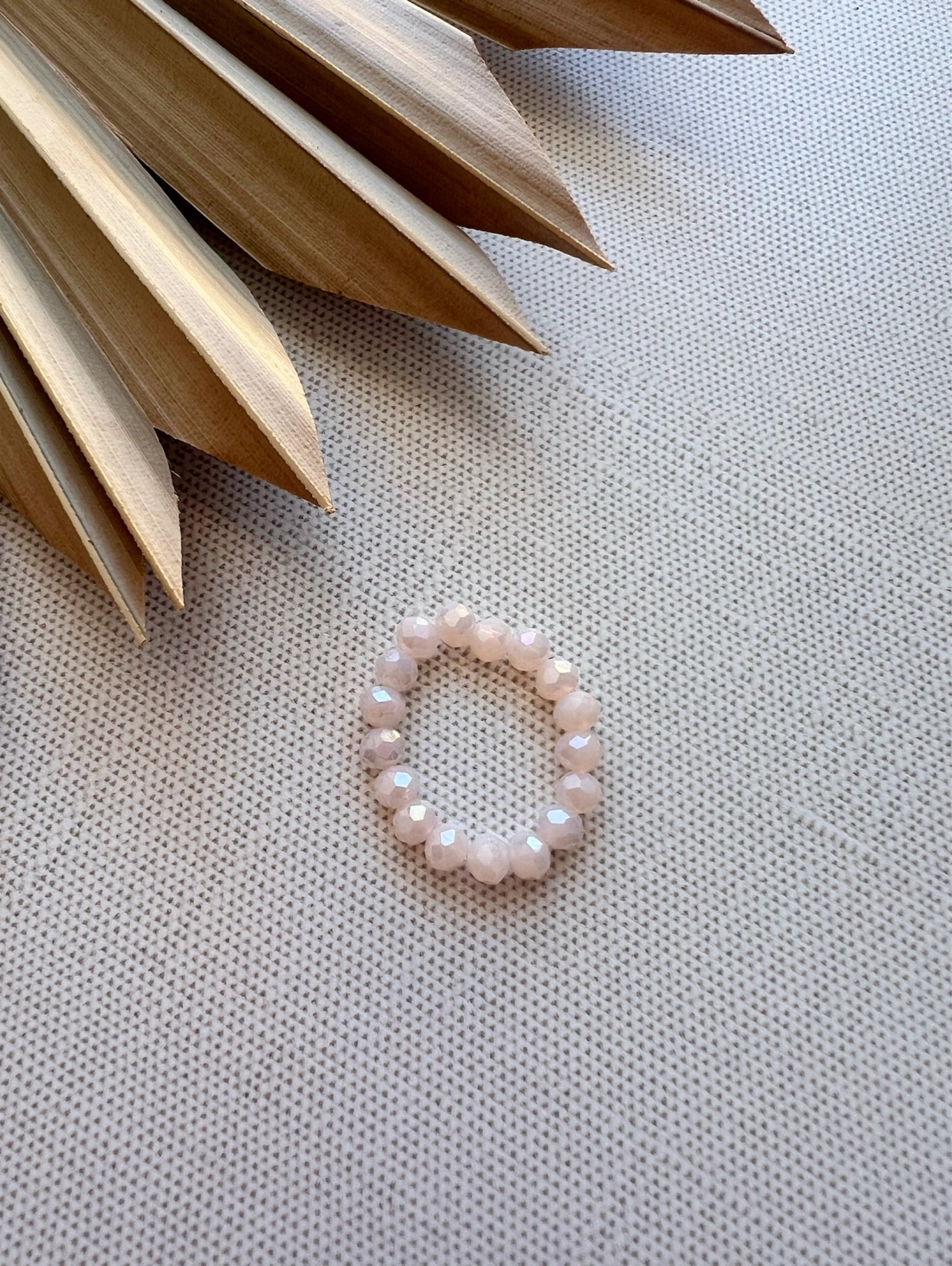 The Blush Aurora Ring features 3mm blush pink crystal beads strung on a stretch cord, ensuring a comfortable fit. The elasticity allows for easy wear without compromising durability, making it suitable for daily wear.