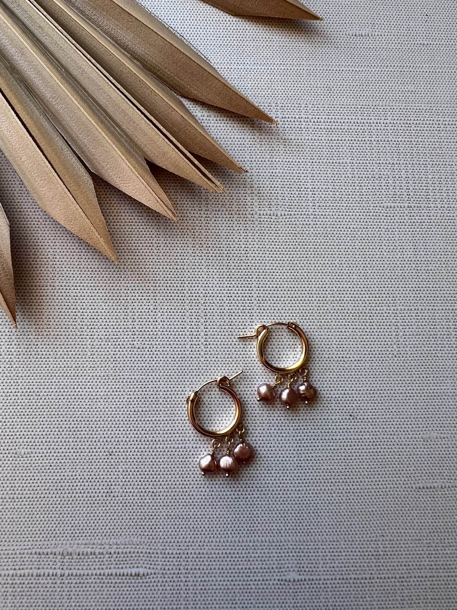 The Three of Hearts hoop earrings feature a 15mm 14k gold fill huggie hoop adorned with three pink freshwater baroque pearls. These earrings offer the perfect combination of elegance and individuality for that special someone.